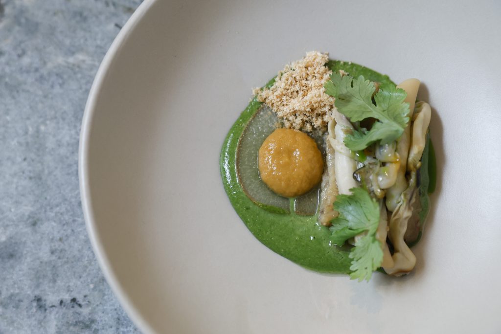 O mais arrojado prato foi o das ovas de bacalhau e búzios, inusitadamente conjugados com coco e batata doce. Os citrinos mão-de-buda e limão galego, usados com parcimónia, conferiram a acidez necessária, a par com os amendoins ligeiramente caramelizados. No fundo, comprovou, uma vez mais, que uma simples conservas é a base de uma criatividade infinita, aprimorada pela pelo trio composta por pescada, polvo e enguia. A estes, o Chef Vítor Adão juntou choco, halófita, batata Atlântica, de Boticas, no distrito de Vila Real, e acrescentou beurre blanc, bem como espuma da pescada.