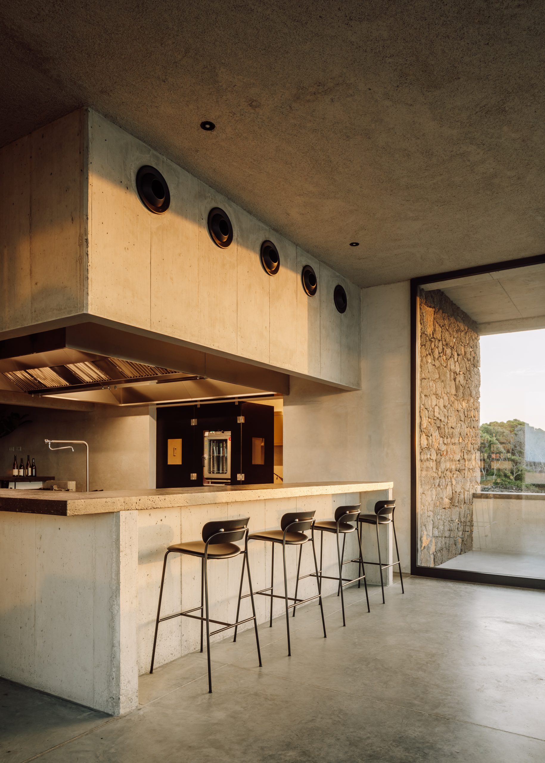 Instalado na área mais elevada da adega, o Latitude é uma ampla panorâmica para o mar e as vizinhas ilhas do Faial e de São Jorge. A esta mais-valia, soma-se a arquitetura e a decoração minimalista e cuidada. Já a comida vai muito além da partilha à mesa. É, isso sim, desenhada para ser apreciada ora ao balcão, que circunda a cozinha aberta e oferece uma vista para a adega, onde são saboreados os menus de quatro ou seis momentos, ora na Mesa Pico, obra-prima de Mircea Anghel, artista romeno radicado em Portugal e fundador do atelier Cabana Studio, na qual é servido o menu de 10 momentos.
