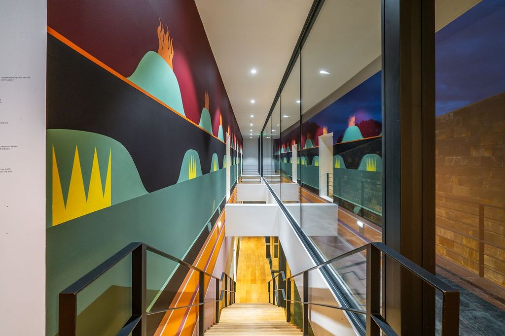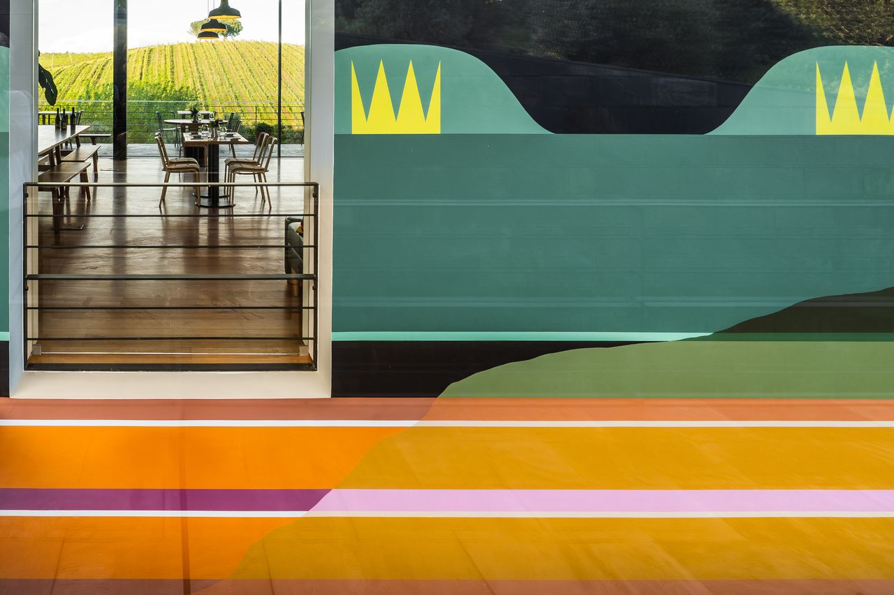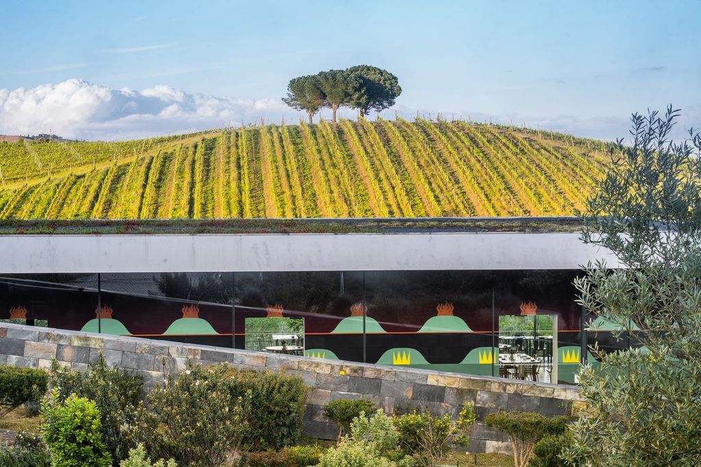 O imenso mural site-specific, com camadas de significados ocultos, cores terrosas profundas e inúmeros símbolos, ecoa as colinas e os vinhedos que se vislumbram através das janelas, também elas imensas, da sala do restaurante, funcionando como a representação de uma narrativa histórica imaginária, que vai desde a introdução das vinhas, feita pelos Romanos naquela região, até pormenores da actualidade. Tudo se mistura numa amálgama de significados, antigos e contemporâneos, pessoais e universais, convergindo numa reflexão única e multifacetada sobre a complexidade do mundo. Assim, cada garrafa torna-se uma extensão da sua obra, permitindo-nos trazer para casa um pedaço da criação artística.