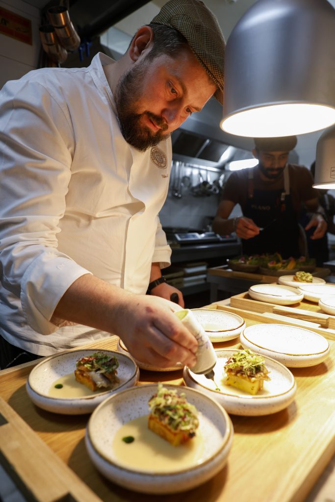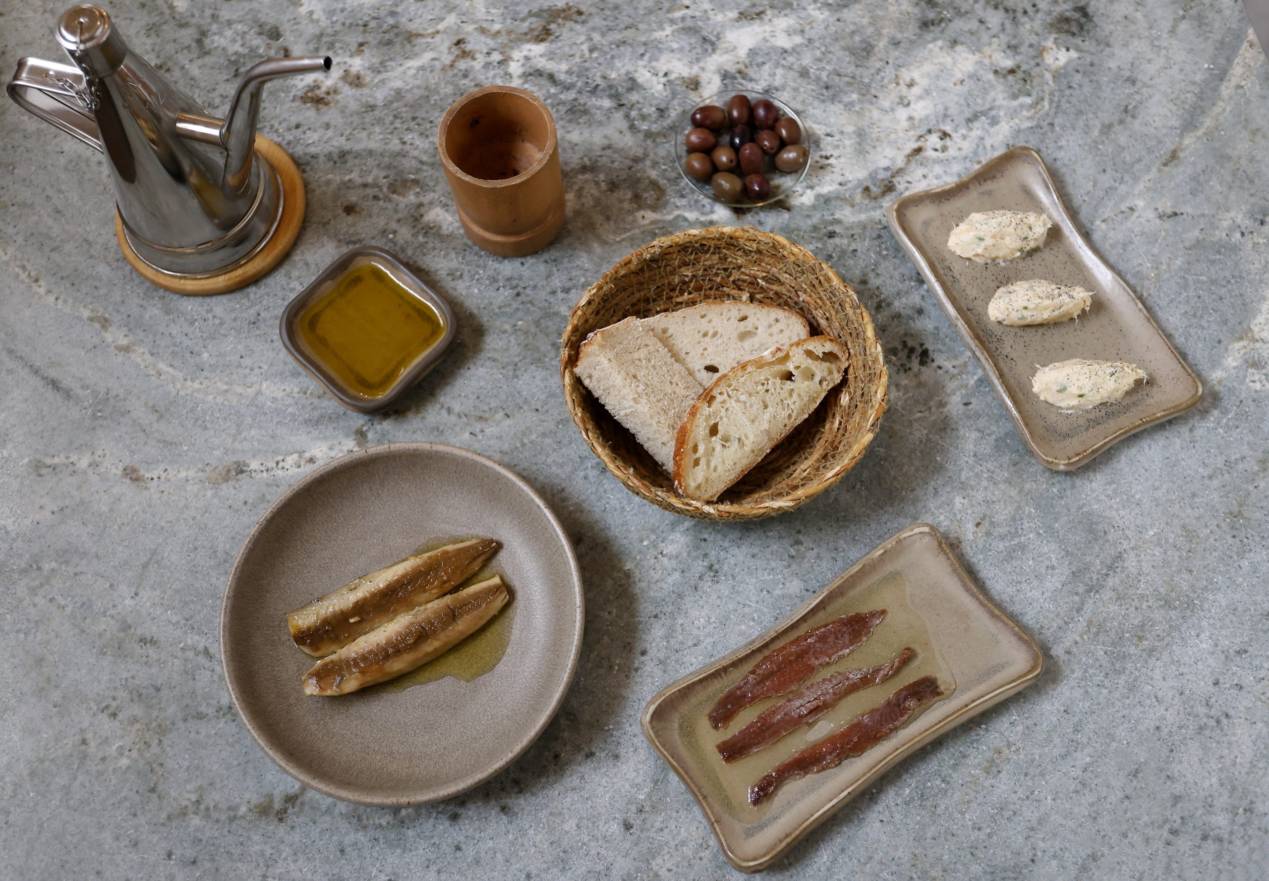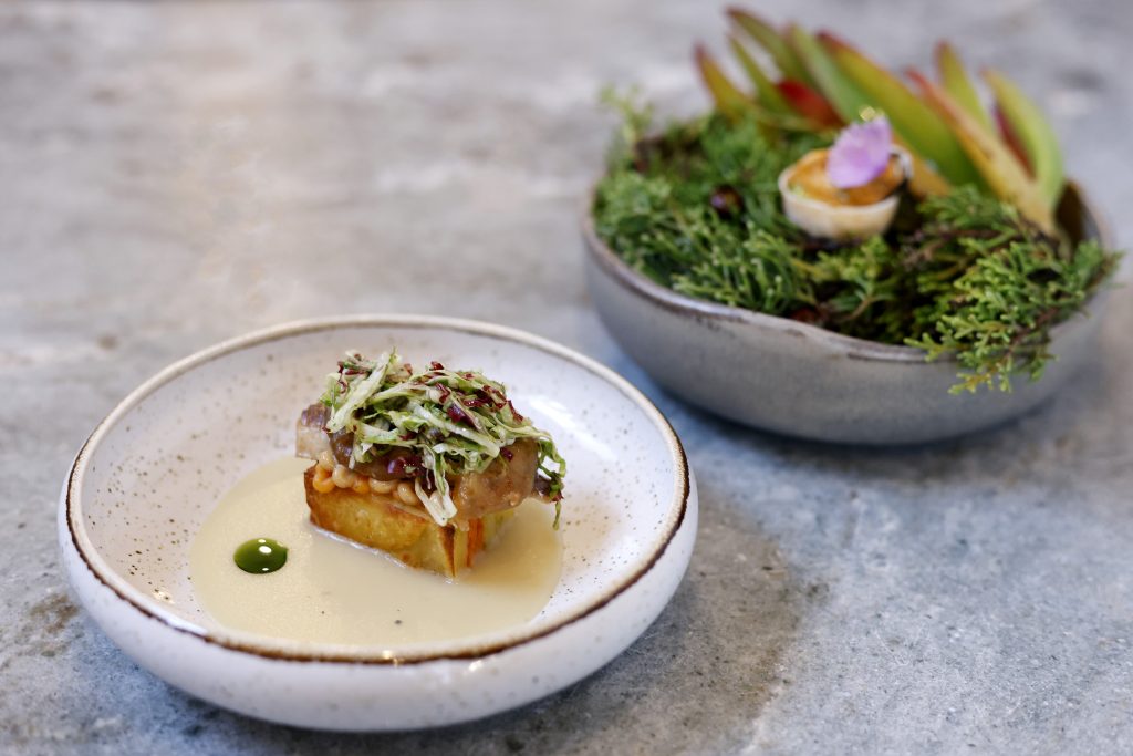 Do início ao fim, o Chef Vítor Adão juntou três ingredientes conservados em cada momento. O primeiro reuniu uma manteiga sem sal de salmão, cavala e anchovas, as duas últimas servidas sem qualquer intervenção. Para acompanhar, foram dispostos, na mesa, pão de trigo e pão de centeio, o azeite biológico de Valpaços e as azeitonas, que fazem parte dos menus de degustação deste espaço de bem comer, onde os fermentados, os preservados e as conservas caseiros são uma constante.