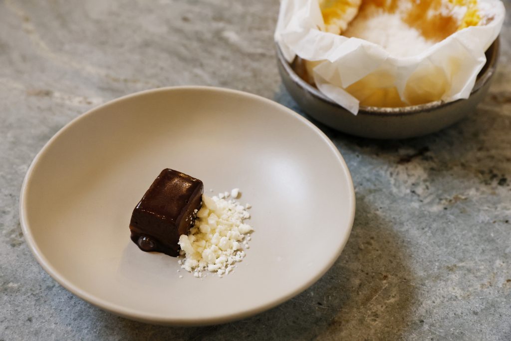 Para finalizar o almoço, inteiramente harmonizado com vinhos da Quinta de Cypriano, localizada em Ponte de Lima, na região dos Vinhos Verdes, o Chef transmontano preparou um lingote de chocolate e lemon curd, cuja acidez cítrica se conjugou na perfeição, com o granizado de Queijo Terrincho, sendo este feito a partir de leite de ovelha Churra, existente na Terra Quente de Trás-os-Montes. Este último fez a ligação com as raspas deste produto, que Vítor Adão coloca generosamente por cima do pão-de-ló, a clássica sobremesa do Plano.
