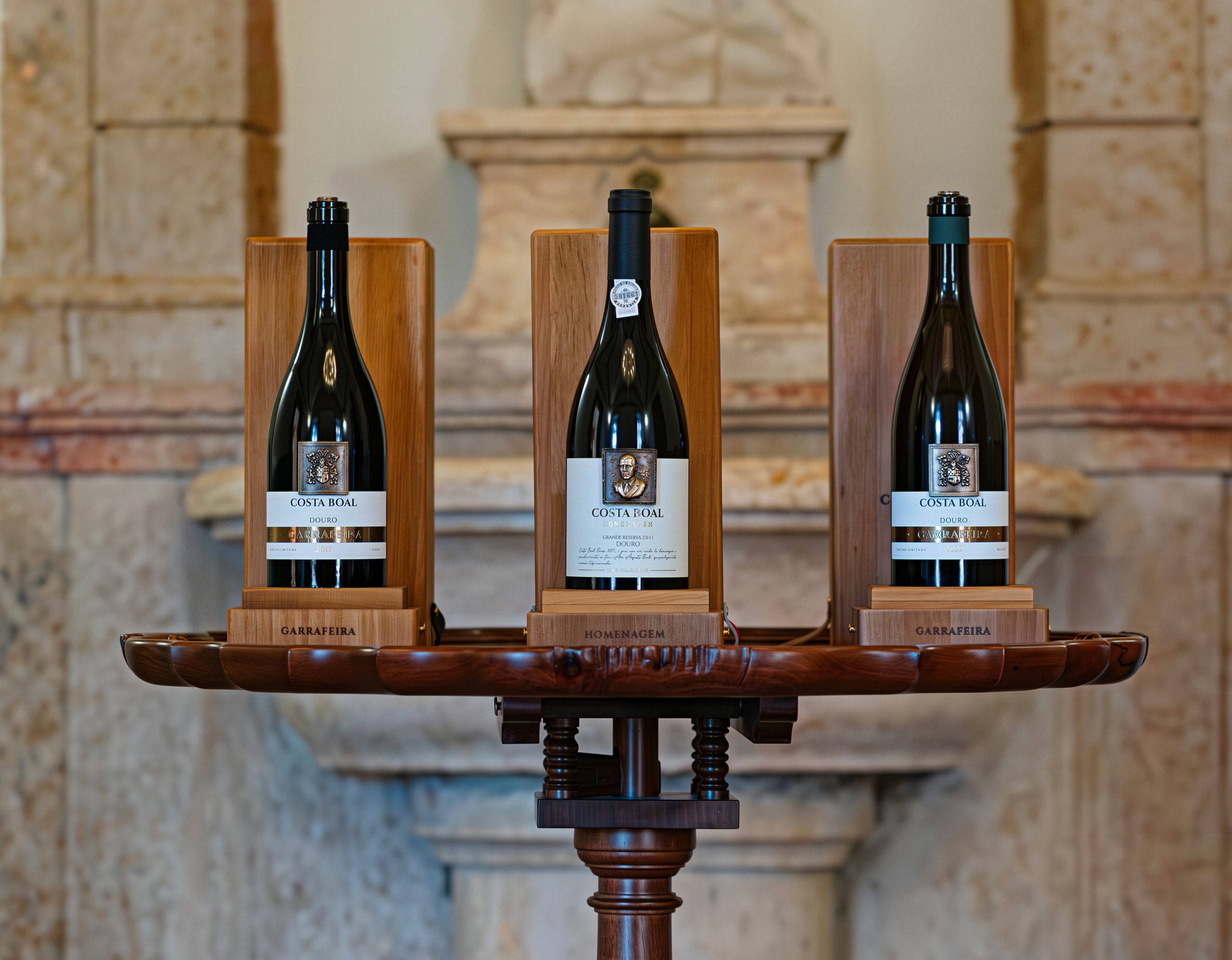 A madeira das matas queimadas em incêndios de 2025, cuidadosamente recuperada e tratada, foi transformada em caixas distintas, para complementar o packaging, seguindo um conceito de reaproveitamento. Duas peças metálicas, uma com o brasão para os Garrafeira e outra com o busto do fundador, no caso do Homenagem, com tratamento “antique”, conferem nobreza ao rótulo e à caixa.
