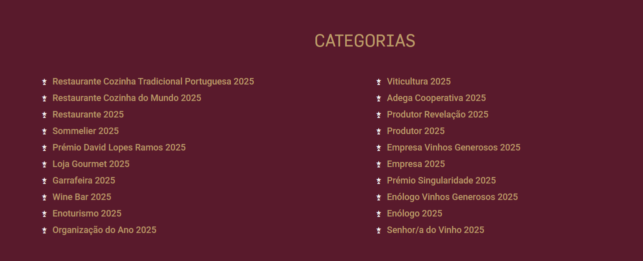No que se refere aos vinhos, a grande espectativa é mais uma vez revelar o Top 30, aqueles que o conjunto de provadores e críticos da Grandes Escolhas consideram serem os 30 melhores vinhos absolutos provados durante o ano 2025, e dentro destes, qual o melhor espumante, o melhor vinho branco, rosé, tinto e fortificado. Ainda nos vinhos são também anunciados os melhores em cada região, aquilo que a revista designa como “Os Melhores de Portugal”.